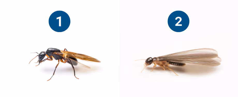 Can you see how Pest #1 has a defined waist and differently-sized wings? Those attributes mean that this is a winged carpenter ant. Pest #2 is a swarming termite, as identified by its equally sized wings, uncinched body,